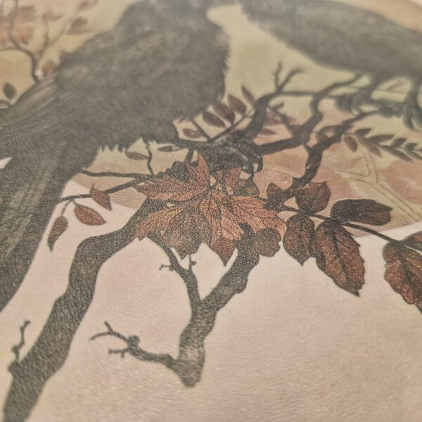 Skórzana naszywka z autorskim motywem dwóch kruków w leśnej oprawie. Wyrazisty, dekoracyjny wzór przeniesiony na miękki nubuk. Dostępna w kilku rozmiarach.