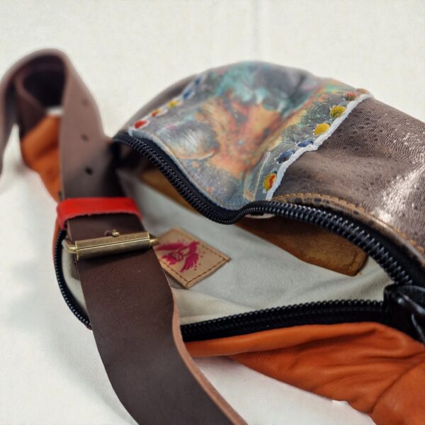 Nerka posiada pojemną komorę główną zapinaną na solidny zamek oraz dodatkową kieszonkę z przodu – idealną na drobiazgi, które chcesz mieć pod ręką. Regulowany skórzany pasek z metalową klamrą pozwala dopasować ją do sylwetki i nosić zarówno w pasie, jak i przewieszoną przez ramię.