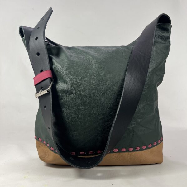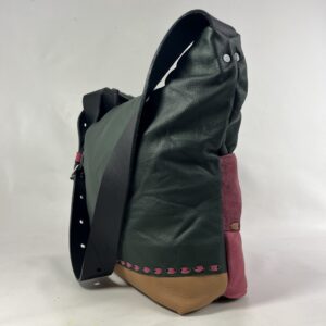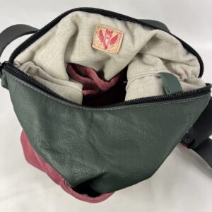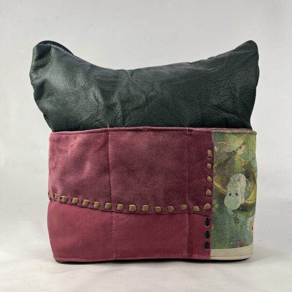Niepowtarzalna torba z duszą — wykonana z połączenia miękkich i trwałych skór w odcieniach różu i zieleni. Front zdobi ręcznie nanoszona skórzana aplikacja.