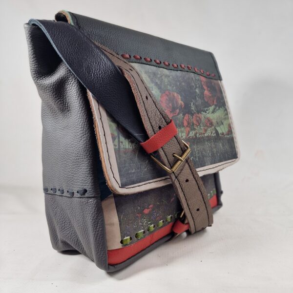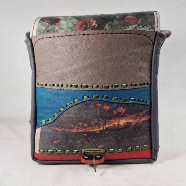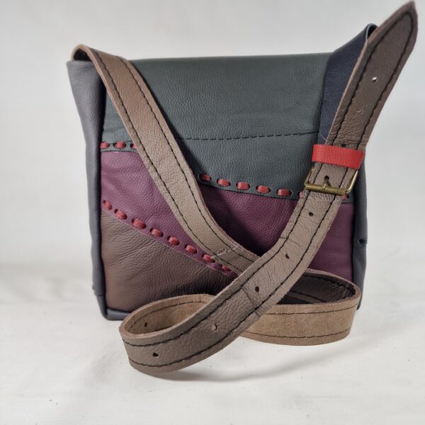 Ta torebka powstała w pracowni rzemieślniczej jako pojedynczy, niepowtarzalny egzemplarz. Każdy model tworzony jest z połączenia różnych skór naturalnych, faktur i detali, dzięki czemu nie istnieją dwie identyczne sztuki.