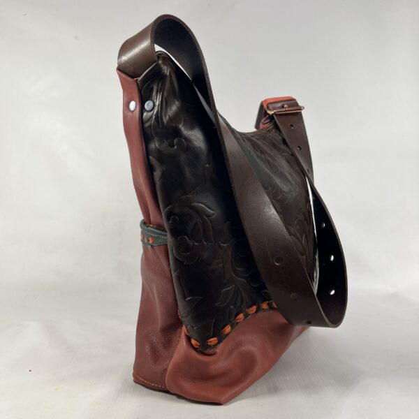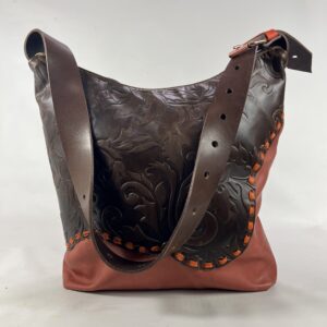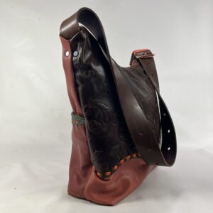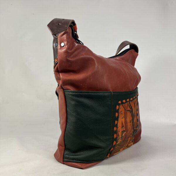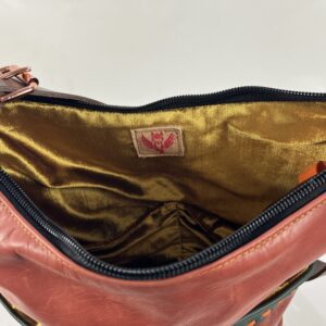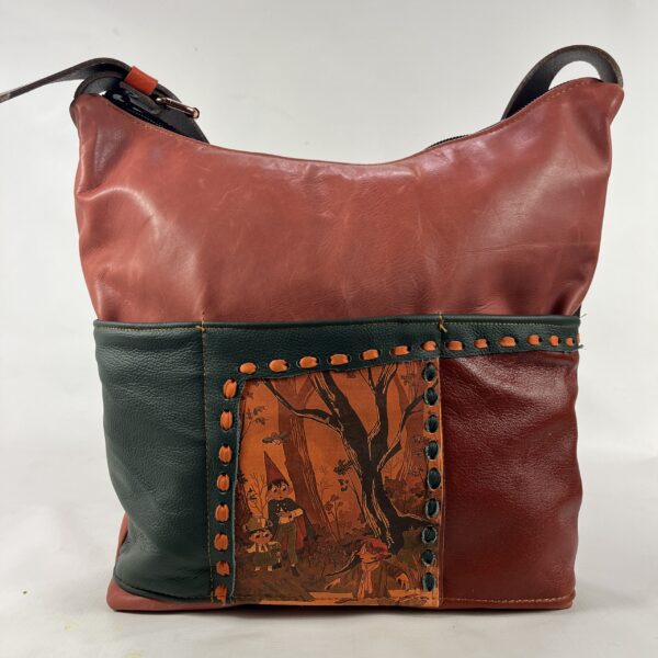 Niepowtarzalna torba z duszą — wykonana z połączenia miękkich i trwałych skór w odcieniach czerwieni, pomarańczu i zieleni. Front zdobi ręcznie nanoszona skórzana aplikacja.