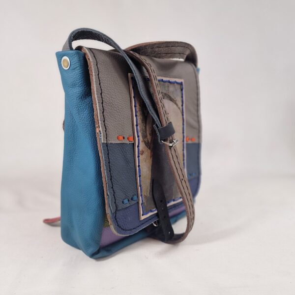 Ta torebka powstała w pracowni rzemieślniczej jako pojedynczy, niepowtarzalny egzemplarz. Każdy model tworzony jest z połączenia różnych skór naturalnych, faktur i detali, dzięki czemu nie istnieją dwie identyczne sztuki.